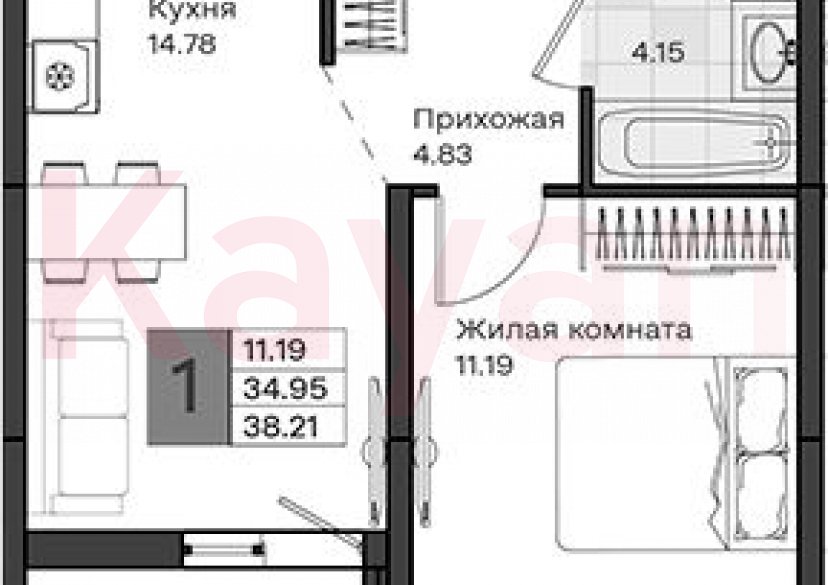 1-комнатная квартира, 34.9 м2, 3/9 этаж