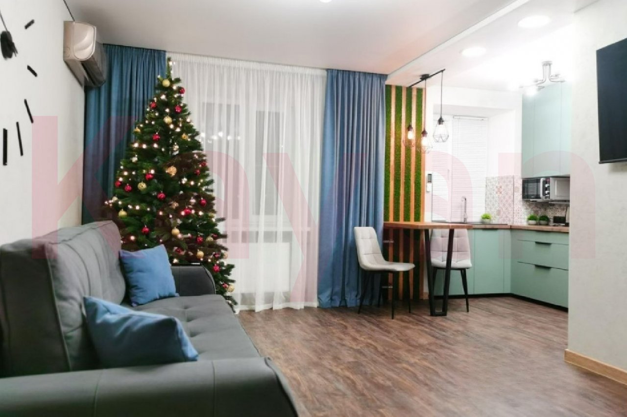 - В комнате во всю ширину установлен красивый и вместительный шкаф-купэ, большая и удобная кровать с ортопедическим матрасом размером 200х180 (делали на заказ), в кухне-гостиной встроен кухонный гарнитур, новый холодильник с фассадом из закаленного черного стекла, вытяжка, микроволновая печь, электроплита, телевизор, качественный и удобный диван с ортопедическим основанием. Барная стойка и декоративные рейки выполнены из массива сосны, покрыты экологически-чистым маслом.