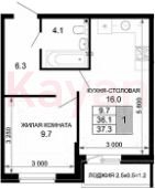 Квартира в ЖК Дыхание (ССК. Краснодарский край) литер 27 очередь 6, Кирпично-монолитный, 1 к.кв., 36.1 кв.м., 2/16, высота потолков: 2.7 м, жилая площадь: 9.7 кв.м., возможна ипотека, площадь кухни 16 кв.м.,