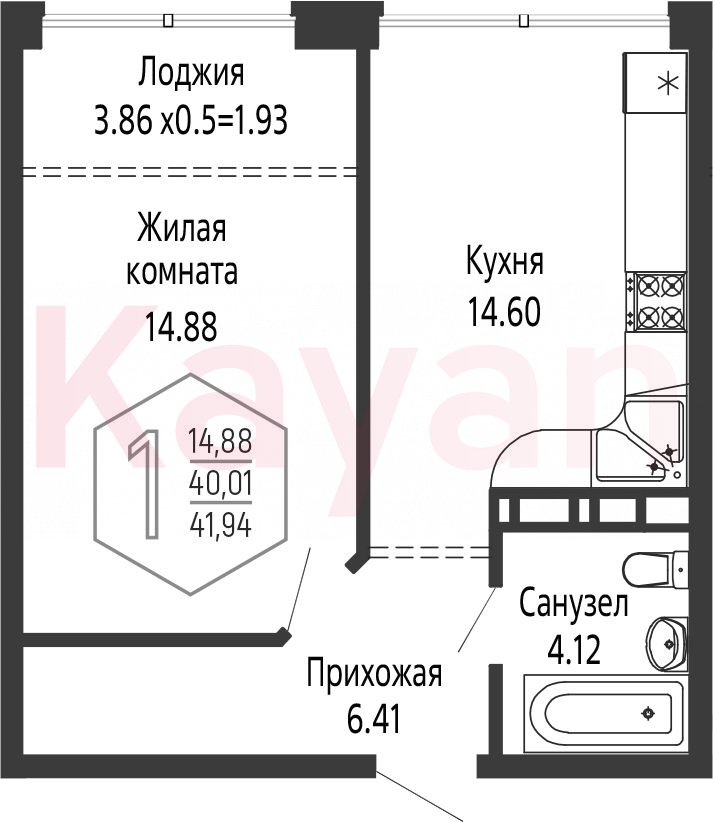Квартира в ЖК «Гарантия на Обрывной» (Гарантия) литер 2 очередь 2, Кирпично-монолитный, 1 к.кв., 40.01 кв.м., 7/16, высота потолков: 2.74 м, жилая площадь: 14.88 кв.м., возможна ипотека, площадь кухни 14.6 кв.м.,