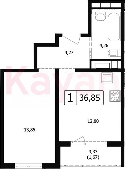 Квартира в ЖК «Парусная регата» (VSN Group) литер 4 очередь 1, Кирпично-монолитный, 1 к.кв., 33.53 кв.м., 6/24, высота потолков: 2.7 м, жилая площадь: 13.85 кв.м., возможна ипотека, площадь кухни 12.8 кв.м.,