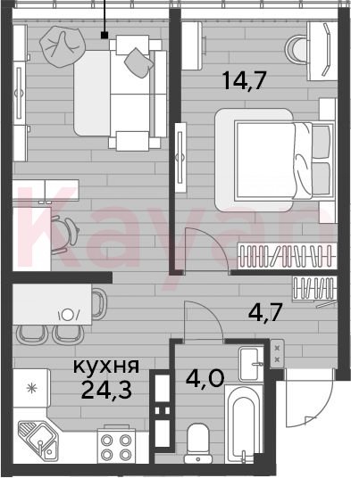 Квартира в ЖК «Dogma park (Догма парк)» (DOGMA. Краснодар) литер 14 очередь 2, Кирпично-монолитный, 1 к.кв., 47.7 кв.м., 18/19, высота потолков: 3.02 м, жилая площадь: 14.7 кв.м., возможна ипотека, возможна военная ипотека, площадь кухни 24.3 кв.м.,