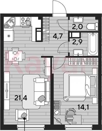 Квартира в ЖК «Dogma park (Догма парк)» (DOGMA. Краснодар) литер 21 очередь 2, Кирпично-монолитный, 1 к.кв., 45.1 кв.м., 13/16, высота потолков: 2.72 м, жилая площадь: 14.1 кв.м., возможна ипотека, возможна военная ипотека, площадь кухни 21.4 кв.м.,