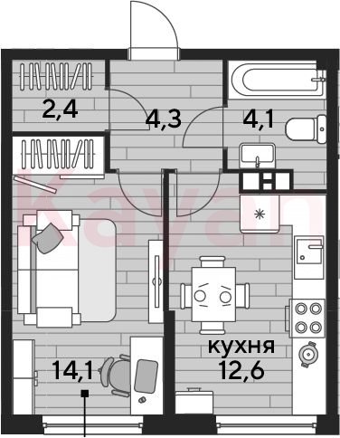 Квартира в ЖК «Dogma park (Догма парк)» (DOGMA. Краснодар) литер 22 очередь 2, Кирпично-монолитный, 1 к.кв., 37.5 кв.м., 6/16, высота потолков: 2.72 м, жилая площадь: 14.1 кв.м., возможна ипотека, возможна военная ипотека, площадь кухни 12.6 кв.м.,