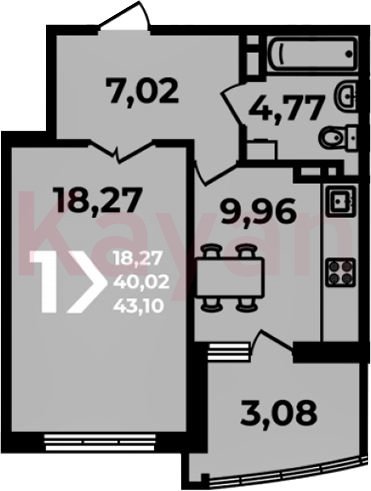 Квартира в ЖК «Аксиома» (Юг-Инжиниринг) литер 2 очередь 1, Кирпично-монолитный, 1 к.кв., 40.02 кв.м., 16/19, высота потолков: 2.72 м, жилая площадь: 18.27 кв.м., возможна ипотека, возможна военная ипотека, площадь кухни 9.96 кв.м.,