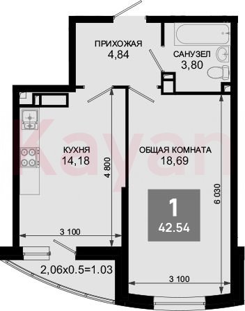 Квартира в ЖК «Лучший» (ССК. Краснодарский край) литер 11 очередь 4, Кирпично-монолитный, 1 к.кв., 41.51 кв.м., 12/19, высота потолков: 2.7 м, жилая площадь: 18.69 кв.м., возможна ипотека, площадь кухни 14.18 кв.м.,