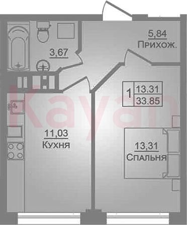 Квартира в ЖК «Портрет» (ART Group) литер 2 очередь 1, Кирпично-монолитный, 1 к.кв., 33.85 кв.м., 4/9, высота потолков: 2.7 м, жилая площадь: 13.31 кв.м., возможна ипотека, возможна военная ипотека, площадь кухни 11.03 кв.м.,