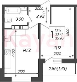 Квартира в ЖК «Смородина» (AVA Краснодар) литер 11 очередь 2, Кирпично-монолитный, 1 к.кв., 33.77 кв.м., 15/16, высота потолков: 2.75 м, жилая площадь: 13.12 кв.м., возможна ипотека, площадь кухни 14.12 кв.м.,