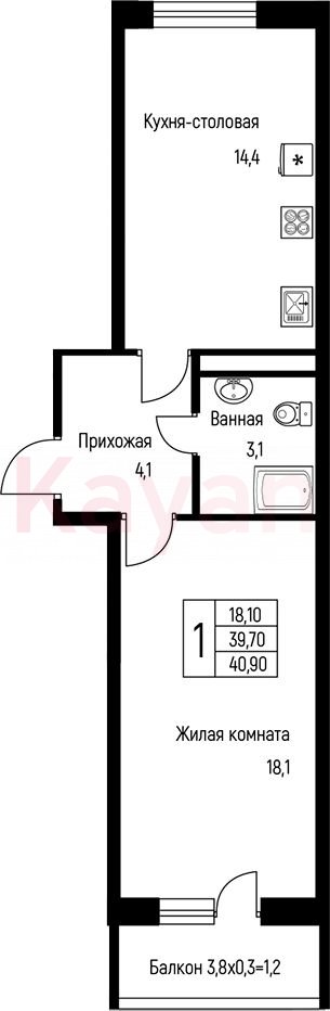 Квартира в ЖК «Nova Vita» (Метрикс Development) литер 18 очередь 3, Газобетон-монолит, 1 к.кв., 41.7 кв.м., 3/3, высота потолков: 2.7 м, жилая площадь: 18.1 кв.м., возможна ипотека, площадь кухни 14.4 кв.м.,
