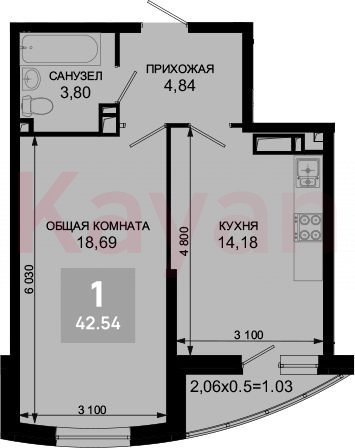 Квартира в ЖК «Лучший» (ССК. Краснодарский край) литер 12 очередь 5, Кирпично-монолитный, 1 к.кв., 41.51 кв.м., 19/19, высота потолков: 2.7 м, жилая площадь: 18.69 кв.м., возможна ипотека, площадь кухни 14.18 кв.м.,