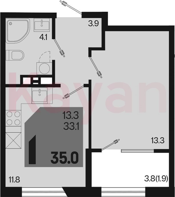 Квартира в ЖК «Первое место» (ГК Точно. Краснодарский край) литер 1.10 Л1 очередь 1, Монолитный, 1 к.кв., 33.1 кв.м., 9/9, высота потолков: 3 м, жилая площадь: 13.3 кв.м., возможна ипотека, возможна военная ипотека, площадь кухни 11.8 кв.м.,