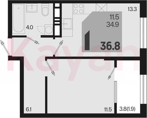 Квартира в ЖК «Первое место» (ГК Точно. Краснодарский край) литер 1.1 Л2 очередь 1, Монолитный, 1 к.кв., 34.9 кв.м., 11/18, высота потолков: 2.66 м, жилая площадь: 11.5 кв.м., возможна ипотека, возможна военная ипотека, площадь кухни 13.3 кв.м.,