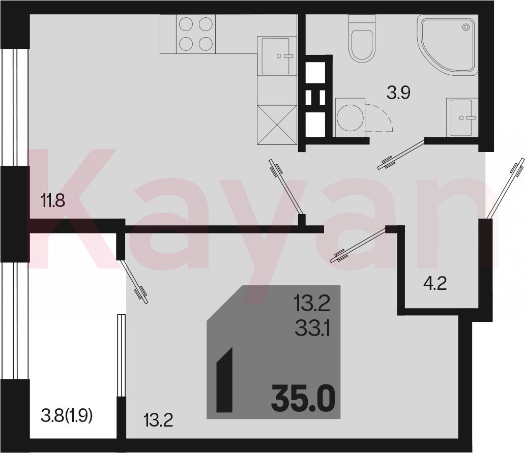 Квартира в ЖК «Первое место» (ГК Точно. Краснодарский край) литер 1.3. Л2 очередь 1, Монолитный, 1 к.кв., 33.1 кв.м., 4/9, высота потолков: 2.66 м, жилая площадь: 13.2 кв.м., возможна ипотека, возможна военная ипотека, площадь кухни 11.8 кв.м.,