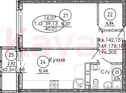Квартира в ЖК «Рокада» (СЗ ГРАДСТРОЙ-КУБАНЬ) литер 1 очередь 1, Кирпично-монолитный, 1 к.кв., 39.13 кв.м., 3/9, высота потолков: 2.75 м, жилая площадь: 16.07 кв.м., возможна ипотека, площадь кухни 12.46 кв.м.,