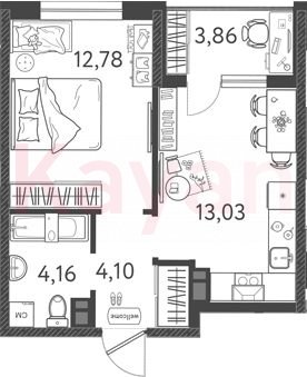 Квартира в ЖК «Друзья» (Семья) литер 8 очередь 2, Монолитный, 1 к.кв., 34.07 кв.м., 3/9, высота потолков: 2.85 м, жилая площадь: 12.78 кв.м., возможна ипотека, возможна военная ипотека, площадь кухни 13.03 кв.м.,