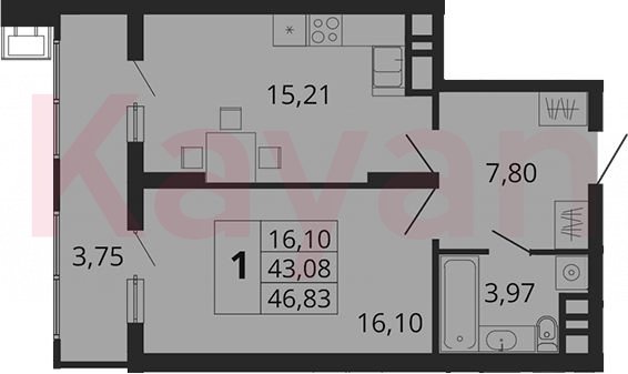 Продажа 1-комн. квартиры, 43.08 кв.м