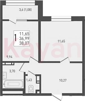 Квартира в ЖК «Югге» (Черноморская Финансовая Компания) литер 2 очередь 2, Кирпично-монолитный, 1 к.кв., 36.99 кв.м., 2/9, высота потолков: 2.9 м, жилая площадь: 11.65 кв.м., возможна ипотека, площадь кухни 9.94 кв.м.,