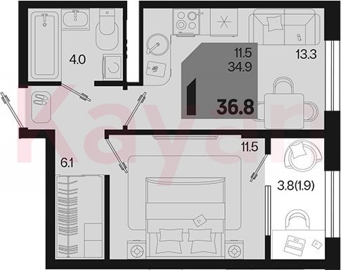 Квартира в ЖК «Первое место» (ГК Точно. Краснодарский край) литер 1.4 Л2 очередь 1, Монолитный, 1 к.кв., 34.9 кв.м., 6/18, высота потолков: 2.66 м, жилая площадь: 11.5 кв.м., возможна ипотека, возможна военная ипотека, площадь кухни 13.3 кв.м.,