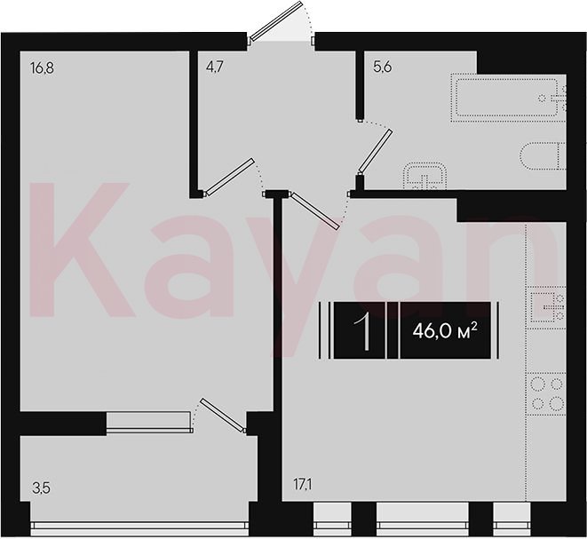 Квартира в ЖК «Эрмитаж» (ГК ЮгСтройИнвест. Краснодар) литер 1.2 очередь 1, Кирпично-монолитный, 1 к.кв., 44.25 кв.м., 4/9, высота потолков: 2.87 м, жилая площадь: 16.8 кв.м., возможна ипотека, возможна военная ипотека, площадь кухни 17.1 кв.м.,