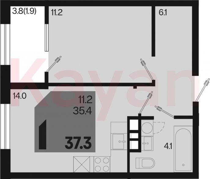 Квартира в ЖК «Первое место» (ГК Точно. Краснодарский край) литер 1.5 Л1 очередь 1, Монолитный, 1 к.кв., 35.4 кв.м., 4/9, высота потолков: 2.66 м, жилая площадь: 11.2 кв.м., возможна ипотека, возможна военная ипотека, площадь кухни 14 кв.м.,