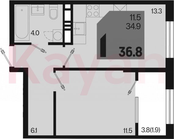 Квартира в ЖК «Первое место» (ГК Точно. Краснодарский край) литер 1.5 Л1 очередь 1, Монолитный, 1 к.кв., 34.9 кв.м., 9/18, высота потолков: 2.66 м, жилая площадь: 11.5 кв.м., возможна ипотека, возможна военная ипотека, площадь кухни 13.3 кв.м.,