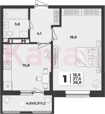 Квартира в ЖК «Лето» (Дарстрой) литер 1.6 очередь 1, Кирпично-монолитный, 1 к.кв., 37.6 кв.м., 6/9, высота потолков: 2.7 м, жилая площадь: 18.9 кв.м., возможна ипотека, площадь кухни 10.8 кв.м.,