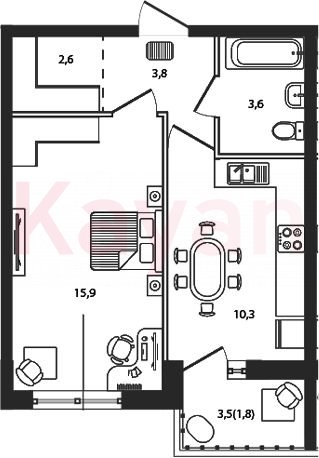 Квартира в ЖК «Сиреневый бульвар» (ЮРСК (Южная региональная строительная компания)) литер 2 очередь 1, Кирпично-монолитный, 1 к.кв., 36.2 кв.м., 6/7, высота потолков: 2.7 м, жилая площадь: 15.9 кв.м., возможна ипотека, площадь кухни 10.3 кв.м.,