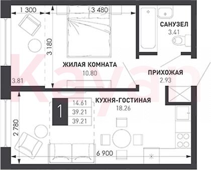 Квартира в ЖК «Иначе в Молодежном» (ГК Иначе) литер 3 очередь 1, Монолитный, 1 к.кв., 35.4 кв.м., 3/9, высота потолков: 2.7 м, жилая площадь: 10.8 кв.м., возможна ипотека, площадь кухни 18.26 кв.м.,