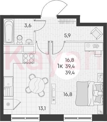 Квартира в ЖК «Green Apple» (БЭЛ-Девелопмент) литер 1 очередь 1, Кирпично-монолитный, 1 к.кв., 39.4 кв.м., 4/14, высота потолков: 2.8 м, жилая площадь: 16.8 кв.м., возможна ипотека, площадь кухни 13.1 кв.м.,