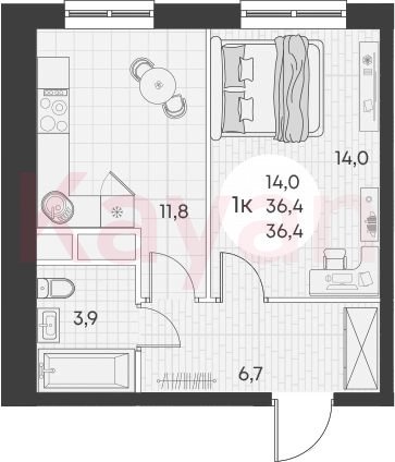 Квартира в ЖК «Green Apple» (БЭЛ-Девелопмент) литер 1 очередь 1, Кирпично-монолитный, 1 к.кв., 36.4 кв.м., 2/15, высота потолков: 2.8 м, жилая площадь: 14 кв.м., возможна ипотека, площадь кухни 11.8 кв.м.,