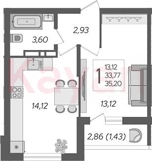 Квартира в ЖК «Смородина» (AVA Краснодар) литер 2 очередь 2, Кирпично-монолитный, 1 к.кв., 33.77 кв.м., 9/16, высота потолков: 2.75 м, жилая площадь: 13.12 кв.м., возможна ипотека, площадь кухни 14.12 кв.м.,