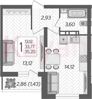 Квартира в ЖК «Смородина» (AVA Краснодар) литер 2 очередь 2, Кирпично-монолитный, 1 к.кв., 33.77 кв.м., 10/16, высота потолков: 2.75 м, жилая площадь: 13.12 кв.м., возможна ипотека, площадь кухни 14.12 кв.м.,