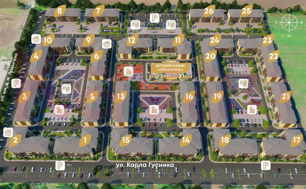 В жилом комплексе предусмотрены благоустроенный двор и свой детский сад. По всей территории ведется круглосуточное видеонаблюдение. Для владельцев автомобилей предусмотрена наземная парковка.