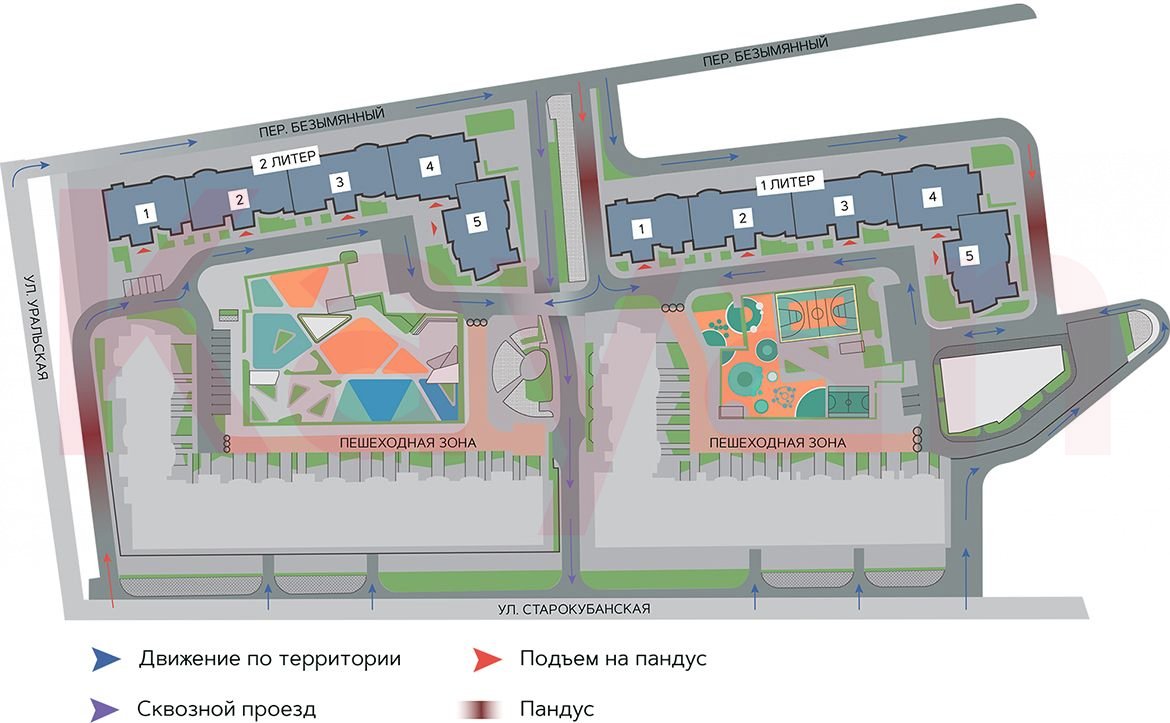На закрытой территории комплекса расположены детские площадки и зоны отдыха со скамейками. Безопасность обеспечена круглосуточной охраной и системой карточного допуска. На первых этажах размещены коммерческие помещения, на последних этажах предусмотрены кладовые. Внутри ЖК расположен фитнес центр и ресторан. Для владельцев автомобилей предусмотрен трехуровневый подземный паркинг.