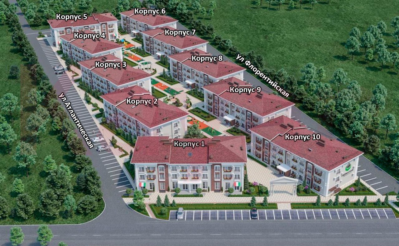 Проект представляет собой малоэтажную застройку высотой в 3 этажа. Состоит из 10 жилых домов спроектированных в едином стиле. Отделка зданий и холлов, выполнена в классическом итальянском стиле с колоннами, коваными перилами, ставнями и витражными окнами.