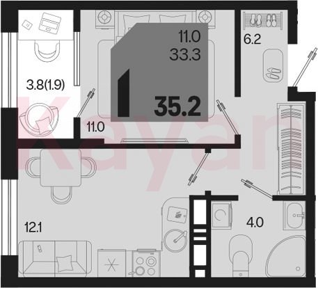 Квартира в ЖК «Первое место» (ГК Точно. Краснодарский край) литер 1.6 Л1 очередь 1, Монолитный, 1 к.кв., 33.3 кв.м., 12/18, высота потолков: 2.66 м, жилая площадь: 11 кв.м., возможна ипотека, возможна военная ипотека, площадь кухни 12.1 кв.м.,