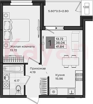 Квартира в МОНО квартал (ИНСИТИ) литер 2 очередь 1, Монолитный, 1 к.кв., 38.04 кв.м., 6/8, высота потолков: 2.75 м, жилая площадь: 13.72 кв.м., возможна ипотека, возможна военная ипотека, площадь кухни 15.96 кв.м.,