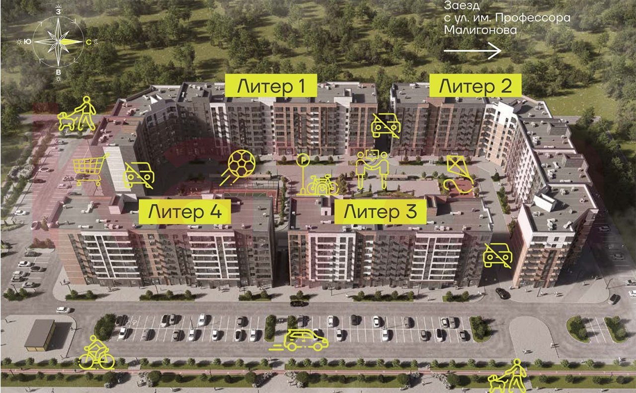Благоустроенный двор включает: игровые площадки для детей, спортивные площадки, велодорожки, места для отдыха и прогулочные аллеи. На первых этажах находятся коммерческие помещения. Для владельцев автомобилей предусмотрена парковка на 639 мест вдоль внешнего периметра.