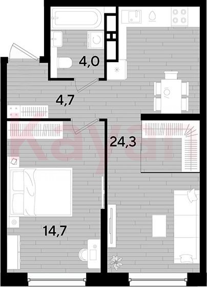 Квартира в ЖК «Dogma park (Догма парк)» (DOGMA. Краснодар) литер 33 очередь 3, Кирпично-монолитный, 1 к.кв., 47.7 кв.м., 11/16, высота потолков: 2.72 м, жилая площадь: 14.7 кв.м., возможна ипотека, возможна военная ипотека, площадь кухни 24.3 кв.м.,