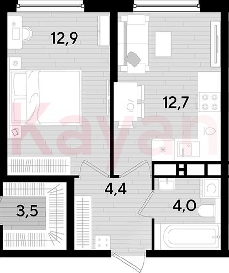 Квартира в ЖК «Dogma park (Догма парк)» (DOGMA. Краснодар) литер 35 очередь 3, Кирпично-монолитный, 1 к.кв., 34 кв.м., 12/16, высота потолков: 2.72 м, жилая площадь: 12.9 кв.м., возможна ипотека, возможна военная ипотека, площадь кухни 12.7 кв.м.,