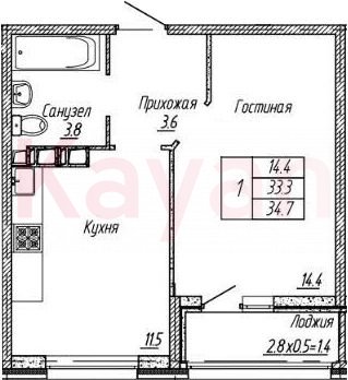Квартира в ЖК «Архитектор» (ГК ЮгСтройИнвест. Краснодар) литер 4.2 очередь 1, Кирпично-монолитный, 1 к.кв., 33.3 кв.м., 5/18, высота потолков: 2.7 м, жилая площадь: 14.4 кв.м., возможна ипотека, возможна военная ипотека, площадь кухни 11.5 кв.м.,