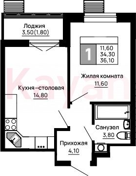 Квартира в ЖК «Традиции» (ССК. Краснодарский край) литер 1 очередь 1, Монолитный, 1 к.кв., 34.3 кв.м., 11/16, высота потолков: 2.72 м, жилая площадь: 11.6 кв.м., возможна ипотека, площадь кухни 14.8 кв.м.,
