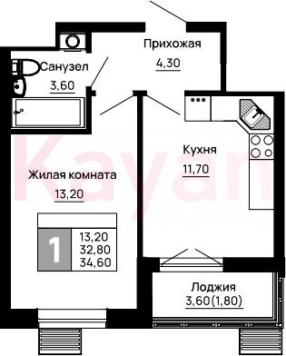 Квартира в ЖК «Традиции» (ССК. Краснодарский край) литер 1 очередь 1, Монолитный, 1 к.кв., 32.8 кв.м., 4/9, высота потолков: 2.72 м, жилая площадь: 13.2 кв.м., возможна ипотека, площадь кухни 11.7 кв.м.,