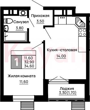 Квартира в ЖК «Традиции» (ССК. Краснодарский край) литер 1 очередь 1, Монолитный, 1 к.кв., 32.9 кв.м., 15/16, высота потолков: 2.72 м, жилая площадь: 11.6 кв.м., возможна ипотека, площадь кухни 14 кв.м.,