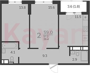Продажа 2-комн. квартиры, 57.2 кв.м