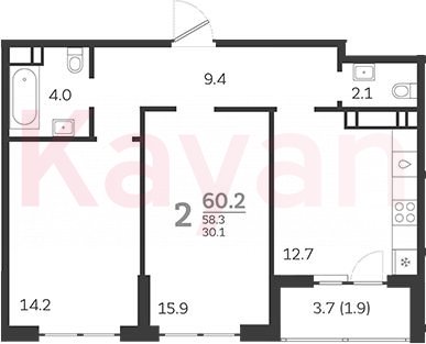 Продажа 2-комн. квартиры, 58.3 кв.м