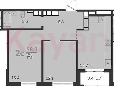 Продажа 2-комн. квартиры, 56.6 кв.м
