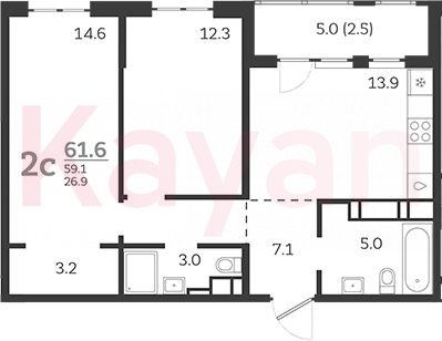 Продажа 2-комн. квартиры, 59.1 кв.м