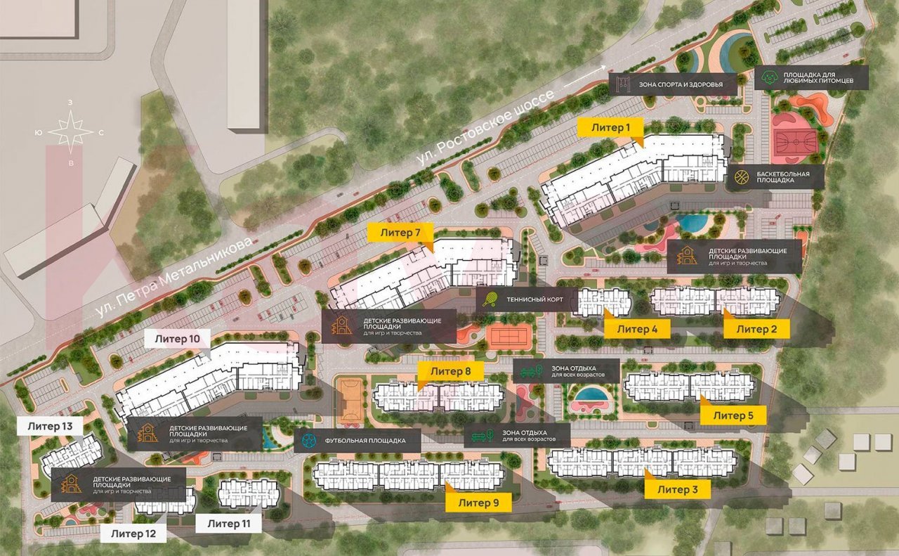 Территория комплекса закрытая, на ней ведется видеонаблюдение. Внутренний двор оснащен современными детскими и спортивными площадками. На территории комплекса спроектирован ландшафтный дизайн, выполнено озеленение. Во дворе работает Wi-Fi. Для владельцев автомобилей предусмотрен наземный паркинг.