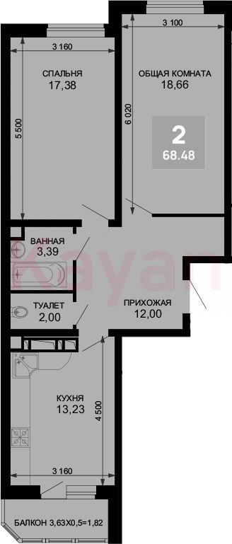 Квартира в ЖК «Лучший» (ССК. Краснодарский край) литер 2 очередь 2, Кирпично-монолитный, 2 к.кв., 66.66 кв.м., 4/19, высота потолков: 2.7 м, жилая площадь: 36.04 кв.м., возможна ипотека, площадь кухни 13.23 кв.м.,